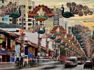 Long exposure image taken on mobile device of the colorful deepavali decorations in the streets of little India