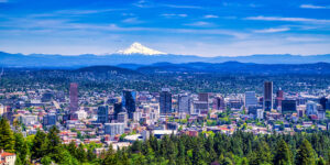 Panorama Portland Oregon skyline with Mt. Hood