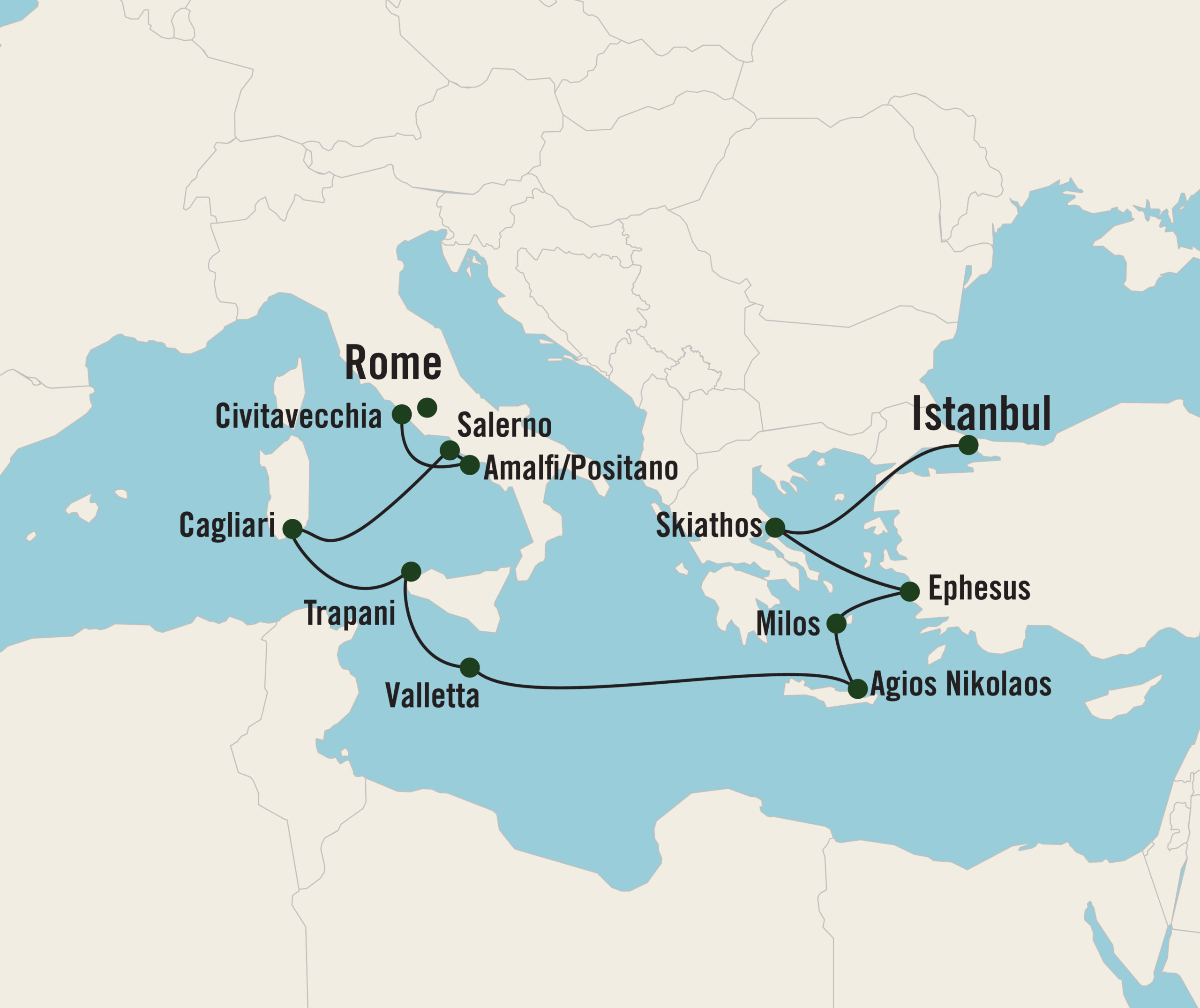 Embark on a timeless, 12-night journey through the Mediterranean aboard Oceania Cruises’ Allura. Embark in Rome, home to the iconic Colosseum, and set sail for Amalfi to marvel at the 12th century Capuchin monastery or enjoy an Amalfi-style farm-to-table experience at a local family’s organic farm. Then, Stroll along Salerno’s elegant lungomare, a shoreside promenade with far-reaching views of the sea and the mountains beyond. Unwind on the pristine beaches of Cagliari, where golden sands meet crystal-clear waters. Indulge in Sicilian cuisine in Trapani, and in Valletta see the celebrated St. John’s Co-Cathedral. Step into the mythical world of the Minoans as you explore Agios Nikolaos. Experience the variety of landscapes, rich history, and picturesque fishing villages of Milos. Explore the well-preserved remnants of Kusadasi, including the Library of Celsus and the Great Theatre. Enjoy the charming villages of Skiathos, and finally before disembarking in Istanbul, explore the city’s spice markets or visit the Blue Mosque.