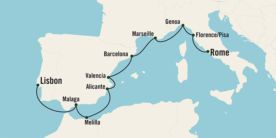 Begin your journey in Lisbon and make way for Malaga. Enjoy an exhilarating hike on a cliff high above the Guadalhorce River or explore Moorish palaces. Sample tapas and pastries in Melilla’s Old Town and discover Moroccan-Spanish flavors. Visit Alicante or escape to Campello for a beach day and swim in the blue waters of the Mediterranean. Explore Valencia by bicycle and see the Valencia Cathedral and Viveros Gardens. See the famed Sagrada Familia church in Barcelona and indulge your romantic side in Marseille as you drink cafe au lait at a sidewalk bistro. Experience the culture and history of Genoa as you meander the twisting caruggi (narrow streets). Take in Italian Renaissance masterpieces in Florence and Pisa, then conclude your journey in Rome, home to iconic landmarks like the Colosseum and Vatican City.