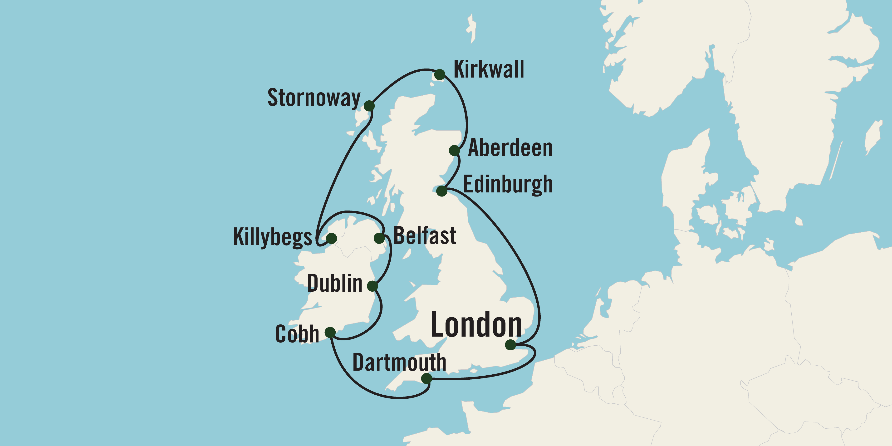 Set sail on an 11-night journey through the heart of the British Isles aboard Oceania Cruises’ Insignia. Begin your journey in London, then venture towards Edinburgh and take a leisurely stroll along the Water of Leith. In Aberdeen, step inside one of Scotland’s most notorious former prisons, now transformed into a museum. In Kirkwall, visit the UNESCO-listed Heart of Neolithic Orkney featuring the 5,000-year-old Standing Stones of Stenness. Explore the stunning Uig coastline aboard an inflatable boat near Stornoway, and in Killybegs, see the world’s largest knotted loom. Let the rainbow-colored buildings of Belfast welcome you to a place where local business and street art thrives. Tour the majestic St. Patrick’s Cathedral in Dublin. Visit Cork, a city adorned with storied castles and known for its culinary masterpieces. Then, before returning to London, spend a day in Dartmouth and wander the charming waterfront streets to capture the essence of a classic English seaside town.