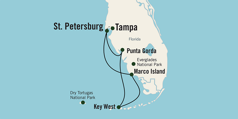 On Marco Island, explore lush mangrove forests, encounter playful dolphins, and feel the soft sand beneath your feet. Key West beckons with its pastel-hued buildings and the chance to sail on a schooner sailboat. In Punta Gorda, take a leisurely stroll through preserved 19th-century architecture, or unwind at a resort where sparkling pools, plush loungers, and sunshine invites you to a day of relaxation. Before concluding your voyage in St. Petersburg, spend a day exploring the city. Experience the artistry of the Salvador Dali Museum or wander the Sunken Gardens at your own pace, discovering a lush botanical paradise.