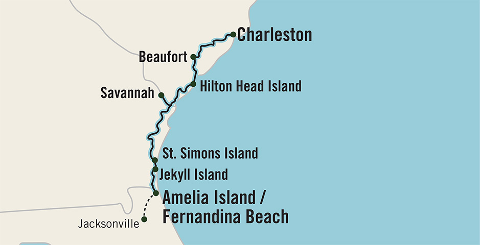 Breathe in South Carolina’s blooming dogwoods and daffodils as you depart from Charleston and make way for Beaufort. Wander through the historic district of Beaufort, known for its beautifully preserved architecture and moss-draped oak trees. Hilton Head awaits with its pristine beaches. Take a leisurely stroll along the sandy shores or indulge in the island’s arts and culture scene. Continue your journey to Savannah to encounter gothic masterpieces, like the Cathedral Basilica of St. John the Baptist. Relax and rejuvenate as you glide past coastal marshes and charming waterfront communities along the Intracoastal Waterway. Discover the Golden Isles on Jekyll Island, historically referred to as the “Millionaire’s Village,” where some of America’s wealthiest families once vacationed. Conclude your voyage on charming Amelia Island, known for its Victorian-era architecture, then transfer to Jacksonville.