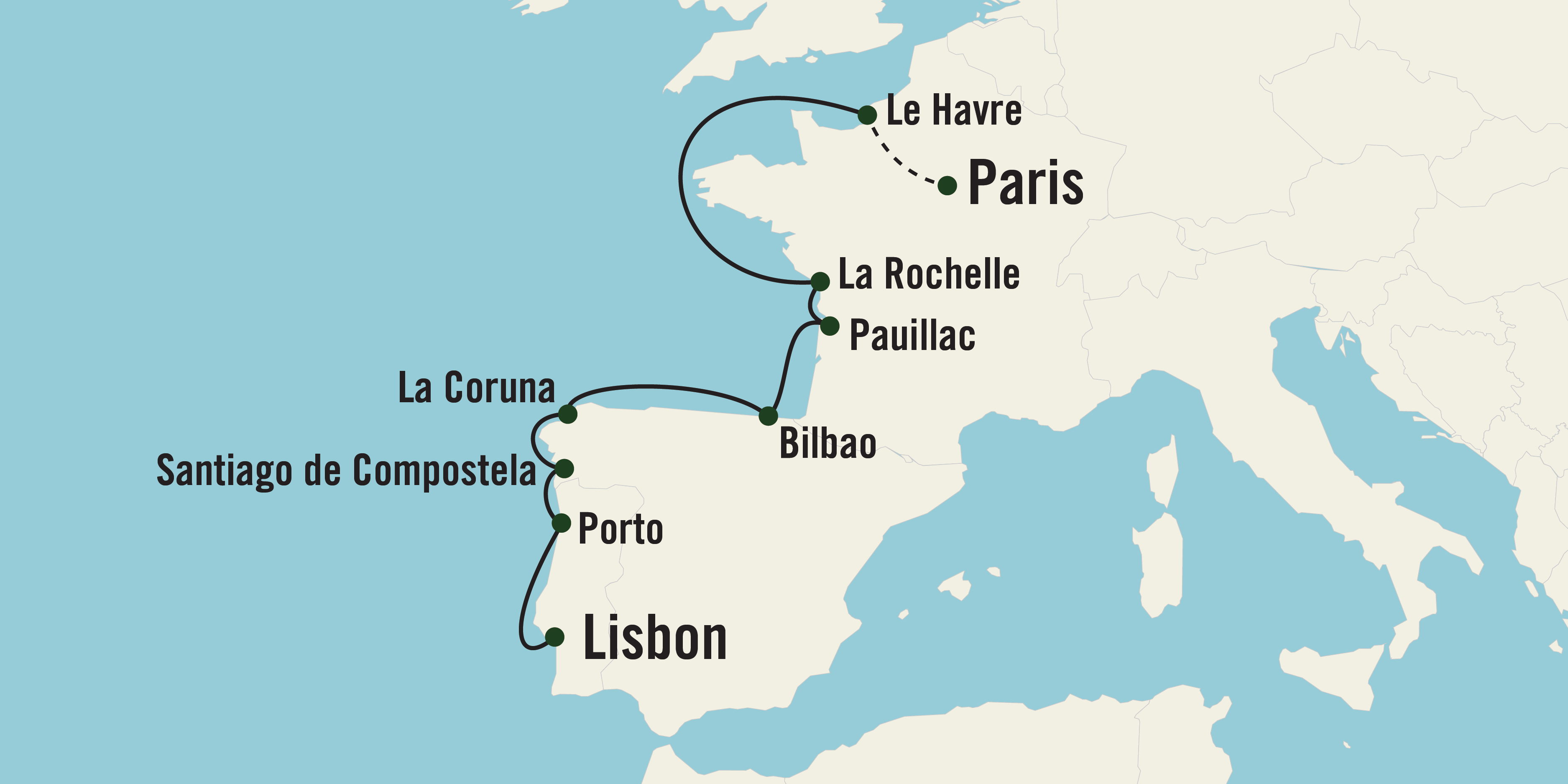 Begin your journey near Paris in Le Havre and set sail for La Rochelle, where medieval architecture frames the harbor and cobblestone pathways lead to cafes. Pauillac places you in the heart of Bordeaux’s vineyards. Visit Chateau Lynch-Bages, a Pauillac winery with roots dating back to the 1600s. Then, travel to Spain, discover Bilbao through a culinary class paired with a visit to the bustling Mercado de la Ribera. In A Coruna, see the legendary Tower of Hercules, a UNESCO World Heritage site. From Vigo, walk the pilgrim path to Santiago de Compostela’s majestic cathedral. Spend your final day in vibrant Porto wandering through its maze of cobblestone streets, and savor authentic Portuguese cuisine at a local eatery. Your journey concludes in Lisbon.