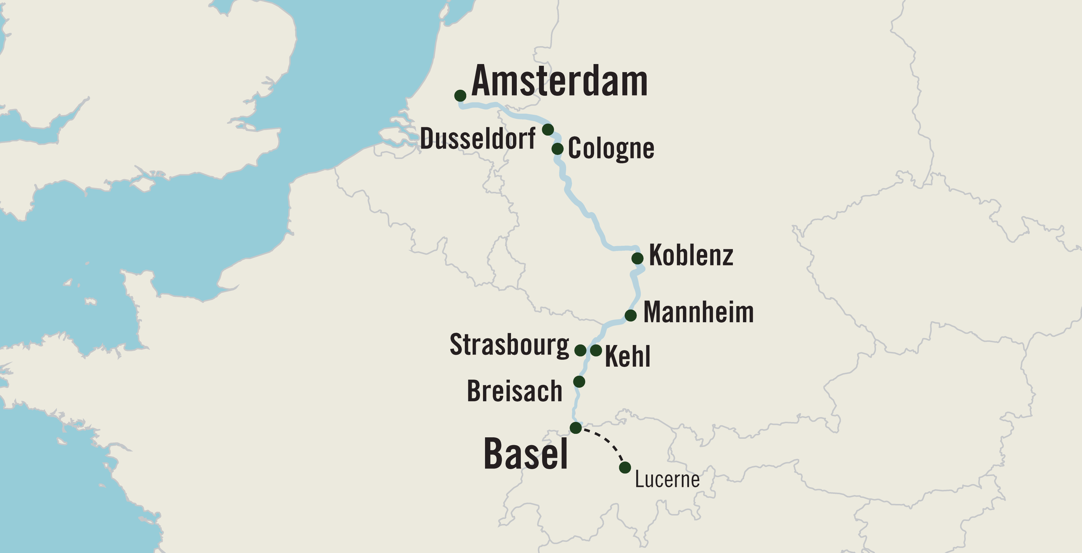Begin your adventure in Amsterdam and cruise the canals fronted by stately Dutch Golden Age mansions. In Cologne, admire the twin-spired Gothic Cathedral, a UNESCO World Heritage Site, and take in the city’s medieval history. Enjoy a leisurely stroll along the Rhine Promenade in Koblenz and take some time to relax in a cafe. In Mannheim, explore Schwetzingen Palace and its picturesque gardens. Witness Strasbourg’s half-timbered homes in “La Petite France,” and hike beneath the Black Forest evergreen canopy of Grimm’s fairy tales. Before ending your journey in Basel, visit Breisach, a lovely German town resting among rolling vineyards.