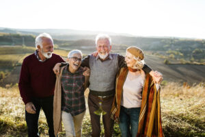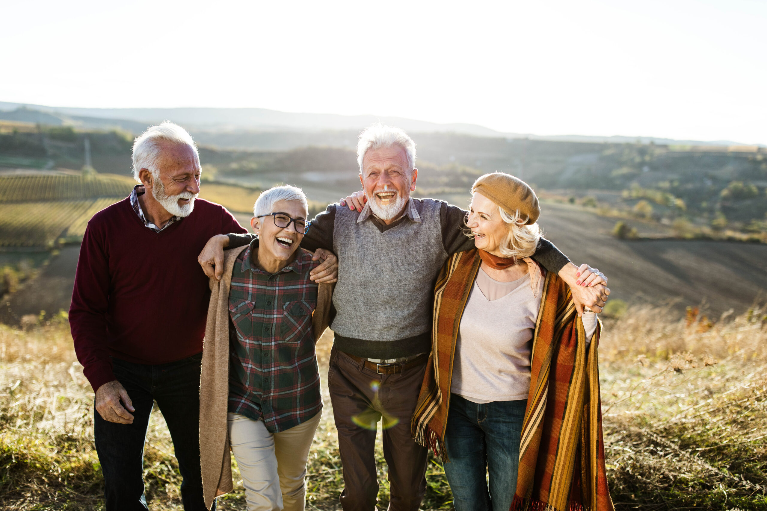 Happy embraced seniors enjoying in autumn walk outdoors.