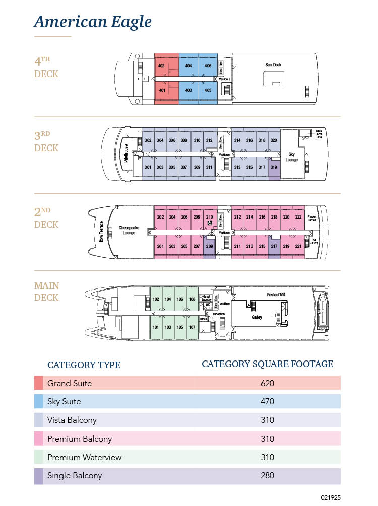 Relax in one of the spacious staterooms and enjoy the scenic views from your private balcony. Or sit at one of the observation areas and admire the splendid vistas with fellow travelers. A sophisticated aesthetic tailors an onboard atmosphere for American Eagle that evokes a sense of pride and appreciation for U.S. history. The choice of color palettes, furnishings, and artwork will reflect the culture of the New England, Chesapeake Bay, and the Southeast.