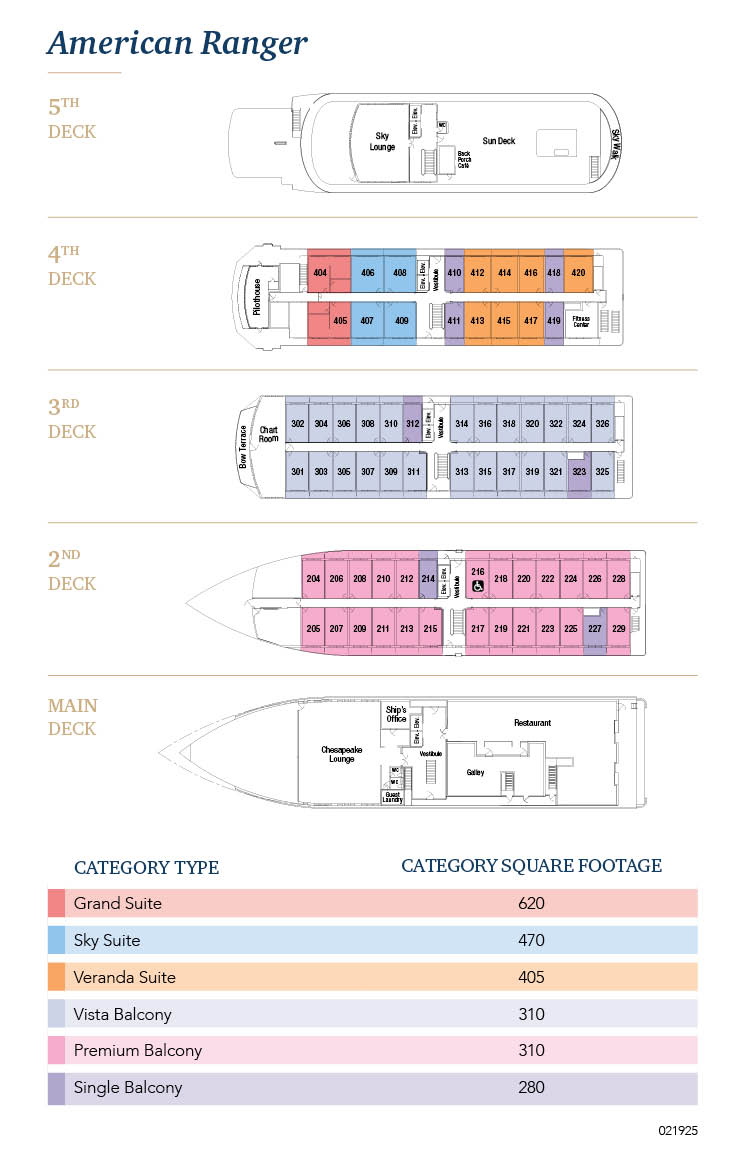 Designed for just 130 guests, this new ship offers a refined cruising experience along the stunning Florida Gulf Coast. With a traditional bow shape, deeper draft, and full stabilization, American Ranger is purpose-built for smooth coastwise exploration, allowing you to sail closer to the shoreline and deeper into discovery. On board, you’ll find thoughtfully curated spaces to relax, connect, and take in the views. The Chesapeake Lounge sets the stage for nightly entertainment, while the Chart Room at the bow invites you to trace the ship’s route or simply enjoy the passing scenery. One of the ship’s most striking features is the reimagined Sky Lounge on the top deck—an airy retreat with panoramic vistas rarely found on a small ship. Just steps away, the 360° Sky Walk walking track, casual café, and inviting lounge chairs offer even more ways to unwind under the open sky.