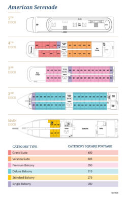 American Serenade also showcases panoramic views throughout, including an impressive four-story glass atrium in the center of the ship. Ranging from 250 to 650 square feet, all of the spacious staterooms offer full-size bathrooms, roomy closets, and private balconies. The new ship also features an on board fitness center and many spacious lounges where you can relax after the day’s adventures.