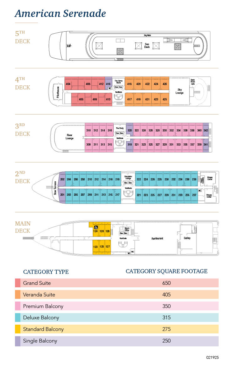 Like her sister ship American Symphony, the 180-passenger American Serenade introduces an updated modern interior design, integrating an elegant and refined aesthetic with our tradition for the spacious comfort found aboard all of our ships. Drawing inspiration from the geography across America, the new interior design highlights natural textural elements and serene color palettes.