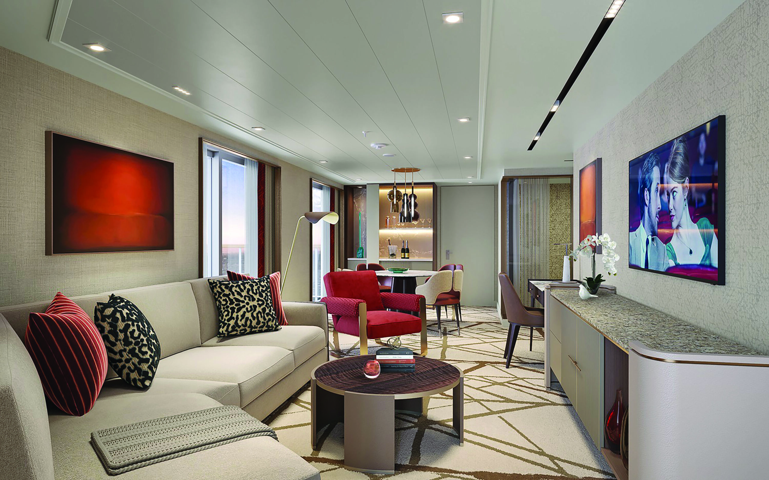 From the moment you first enter your Horizon Suite, you’re struck by how light floods every corner, highlighting the exquisite designer touches, rich textiles and inviting colors. These opulent suites are meticulously crafted to maximize space and comfort, offering over 600 square feet from the entrance to the oversized veranda. As you move through the separate living and bedroom areas, you have the option to partition the space with a pocket door for added privacy. Your Horizon Suite also boasts a spacious walk-through closet with ample storage. Step outside to your private, oversized veranda, furnished with an outdoor dining table, a plush sofa and sun loungers.